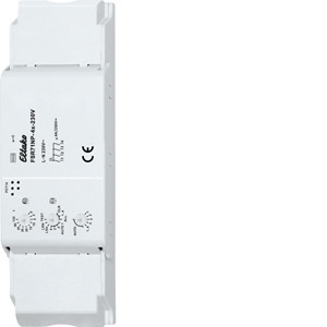 Stromstoß-Schaltrelais mit 4 Kanälen, je 1 Schließer nicht potenzialfrei 4A/250V AC. Mit Lichtszenensteuerung über PC oder mit Funktastern. Verschlüsselter Funk, bidirektionaler Funk und Repeater-Funktion zuschaltbar. Stand-by-Verlust nur 0,8 Watt. Montage in die 230V-Netzanschlussleitung, zum Beispiel in Zwischendecken und Leuchten. 146mm lang, 46mm breit und 31mm tief. Beim Ausfall der Versorgungsspannung wird definiert ausgeschaltet. Die Kanäle können unabhängig voneinander als ES- oder ER-Kanal eingelernt werden. Szenen-Steuerung: Mit einem der vier Steuersignale eines als Szenentaster eingelernten Tasters mit Doppelwippe können mehrere Kanäle eines oder mehrerer FSR71NP-4x zu je einer Szene ein- bzw. ausgeschaltet werden. Zentralbefehle am PC werden mit der Gebäudefunk-Visualisierungs- und Steuerungs-Software GFVS gesendet. Hierzu am PC einen oder mehrere FSR71NP-4x einlernen. Mit den Drehschaltern werden die Taster eingelernt und gegebenenfalls die 4 Kanäle getestet. Für den Normalbetrieb werden der mittlere und der untere Drehschalter anschließend auf AUTO gestellt. Bei dem oberen Drehschalter wird ggf. für alle Kanäle gleich die EW-Zeit (0-120 Sekunden) für Relais bzw. die RV-Zeit (0-120 Minuten) für Stromstoßschalter eingestellt. Werden Funk-Bewegungs-Helligkeitssensoren FBH (Master) und / oder FBH (Slave) eingelernt, wird mit dem oberen Drehschalter, für jeden Kanal getrennt, die Schaltschwelle festgelegt, bei welcher die Beleuchtung einschaltet bzw. ausschaltet. Einstellungen des oberen Drehschalters gemäß Bedienungsanleitung. Werden Funk-Helligkeitssensoren FAH60 eingelernt, wird mit dem oberen Drehschalter, für jeden Kanal getrennt, die Schaltschwelle festgelegt, bei welcher in Abhängigkeit von der Helligkeit die Beleuchtung einschaltet bzw. ausschaltet (von ca. 0lux in der Position 0 bis ca. 50lux in der Position 120). Eine Hysterese von ca. 300lux zwischen dem Ein-und Ausschalten ist fest eingestellt. Eine zusätzlich eingestellte RV-Zeit wird nicht beachtet. Je Kanal kann nur ein FBH oder FAH eingelernt werden. Ein FBH oder FAH kann jedoch in mehrere Kanäle eingelernt werden. Werden Funk-Fenster-Türkontakte FTK oder Hoppe-Fenstergriffe eingelernt, lassen sich mit dem mittleren Drehschalter in den Positionen AUTO 1 bis AUTO 4 unterschiedliche Funktionen einstellen und maximal 116 FTK verknüpfen: AUTO 1 = Fenster zu, dann Ausgang aktiv. AUTO 2 = Fenster offen, dann Ausgang aktiv. In den Stellungen AUTO 3 und AUTO 4 sind die auf einem Kanal eingelernten FTK automatisch verknüpft. Bei AUTO 3 müssen alle FTK geschlossen sein, damit der Arbeitskontakt schließt (z. B. für Klimasteuerung). Bei AUTO 4 genügt ein geöffneter FTK, um den Arbeitskontakt zu schließen (z. B. für Alarmmeldung oder Zuschalten der Stromversorgung eines Dunstabzuges). Ein oder mehrere FTK können in mehrere Kanäle eingelernt werden, damit verschiedene Funktionen gleichzeitig je FTK möglich sind. Nach einem Stromausfall wird die Verknüpfung durch ein neues Signal der FTK bzw. bei der nächsten Statusmeldung nach 15 Minuten wieder hergestellt. Eine zusätzlich eingestellte RV-Zeit wird nicht beachtet. Werden Wassersensoren eingelernt, lassen sich mit dem mittleren Drehschalter in den Positionen AUTO 1 bis AUTO 4 unterschiedliche Funktionen einstellen. AUTO 1 = kein Wasser, dann Arbeitskontakt geschlossen. AUTO 2 = Wasser, dann Arbeitskontakt geschlossen. In den Stellungen AUTO 3 und AUTO 4 sind die auf einem Kanal eingelernten Wassersensoren automatisch verknüpft. Bei AUTO 3 müssen alle Wassersensoren kein Wasser gemeldet haben, damit der Arbeitskontakt schließt. Der Arbeitskontakt öffnet, wenn ein Wassersensor Wasser meldet. Bei AUTO 4 schließt der Arbeitskontakt, wenn ein Wassersensor Wasser meldet, erst wenn alle Wassersensoren kein Wasser gemeldet haben öffnet der Arbeitskontakt. Eine zusätzlich eingestellte RV-Zeit wird nicht beachtet.Die LED unter dem oberen Drehschalter begleitet den Einlernvorgang gemäß Bedienungsanleitung und zeigt im Betrieb Steuerbefehle durch kurzes Aufblinken an.