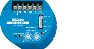 Powerline-Universal-Dimmaktor. 53x43mm, 40mm tief, für Montage in 58mm-Schalterdosen. Power MOSFET bis 300W. Automatische Lampenerkennung. Sensoreingang 230V. Stand-by-Verlust nur 0,6 Watt. Zum Steuern und Dimmen an gleicher Stelle. Universal-Dimmschalter für Lampen bis 300W, abhängig von den Lüftungsverhältnissen. Dimmbare Energiesparlampen ESL und dimmbare 230V-LED-Lampen zusätzlich abhängig von der Lampenelektronik. Keine Mindestlast erforderlich. Schaltung mit Soft-Ein und Soft-Aus zur Lampenschonung. Kurze Steuerbefehle schalten ein/aus, permanente Ansteuerung verändert die Helligkeit bis zum maximalen oder minimalen Wert. Eine Unterbrechung der Ansteuerung ändert die Dimmrichtung. Die eingestellte Helligkeitsstufe bleibt beim Ausschalten gespeichert (Memory). Minimale und maximale Helligkeit können mit SIENNA-Professional geändert werden. Bei einem Stromausfall werden die Schaltstellung und die Helligkeitsstufe gespeichert und wird gegebenenfalls bei Wiederkehr der Versorgungsspannung eingeschaltet. Automatische elektronische Überlastsicherung und Übertemperatur-Abschaltung. Für die Adresszuweisung befinden sich auf der Vorderseite zwei Drehschalter: Der linke Drehschalter bestimmt die Gruppenadresse g mit 16 alphabetischen Werten von A bis P. Der rechte Drehschalter bestimmt die Elementadresse e mit 16 numerischen Werten von 0 bis 15. Oberhalb davon befindet sich ein Schiebeschalter als Konfigurationschalter: Die Stellung AUTO1 lässt das Dimmen aller Lampenarten bis 300 Watt zu. Die Stellung LC1 ist eine Comfort-Stellung für LED-Lampen bis 150 Watt, welche sich auf AUTO (Phasenabschnitt) konstruktionsbedingt nicht weit genug abdimmen lassen und daher auf Phasenanschnitt gezwungen werden müssen. Die Stellung AUTO2 lässt das Dimmen aller Lampenarten bis 300 Watt zu. Erhöhte Mindesthelligkeit gegenüber AUTO1. In der Stellung LC1 dürfen keine induktiven (gewickelten) Trafos verwendet werden. Außerdem ist die maximale Anzahl dimmbarer LED-Lampen konstruktionsbedingt niedriger als in der Stellung AUTO. Über die PC-Software Sienna-Professional kann auf alle Einträge und Konfigurationen auch über das Stromnetz zugegriffen werden. L-Lasten (induktive Lasten, z.B. gewickelte Transformatoren) und C-Lasten (kapazitive Lasten, z.B. elektronische Transformatoren und LED-Lampen) dürfen nicht gemischt werden. R-Lasten (ohmsche Lasten, z.B. 230V-Glüh- und Halogenlampen) können beliebig zugemischt werden. Links von den Drehschaltern befindet sich eine rote LED, welche alle Aktivitäten anzeigt. Daneben befindet sich die Reset-Taste und rechts davon ein Service Pin. Funktionen gemäß Bedienungsanleitung. Die oben liegenden Anschlussklemmen sind Steckklemmen für Leiterquerschnitte von 0,2mm² bis 1,5mm².