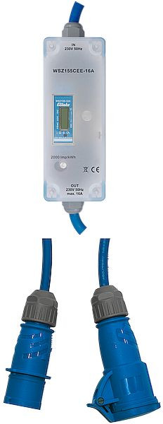 Mobiler Wechselstromzähler mit CEE-Stecker und CEE-Kupplung. Für Innen- und Außenbereich geeignet. Maximalstrom 16 A. Schutzart IP54. Stand-by-Verlust nur 0,4 Watt. Gehäuse-Abmessungen 155 x 60 x 82 mm, Anschlussleitung 1,5 m (inkl. Stecker und Kupplung). Genauigkeitsklasse B (1%). Dieser mobile Wechselstromzähler misst die Wirkenergie anhand des zwischen dem Eingang und dem Ausgang fließenden Stromes. Der Eigenverbrauch von nur maximal 0,4 Watt Wirkleistung wird nicht gemessen und nicht angezeigt. Zyklisch wechselt die Anzeige auf dem Display alle 10 Sekunden zwischen der aufgelaufenen Wirkenergie in kWh und dem Momentanverbrauch in kW. Der Anlaufstrom ist 20 mA. Das Display kann nur mit Stromversorgung abgelesen werden. Der Verbrauch ist jedoch nichtflüchtig gespeichert und wird nach einem Stromausfall sofort wieder angezeigt. Die Digitalanzeige hat 7 Stellen. Bis 99999,99 kWh werden zwei Nachkommastellen angezeigt, ab 100000,0 kWh nur noch eine. Der mobile Wechselstromzähler ist mit einem Haltebügel für eine einfache Montage ausgestattet. Dieser kann, falls nicht notwendig, einfach entfernt werden. Der Leistungsbezug wird mit einer 2000-mal je kWh blinkenden LED angezeigt.