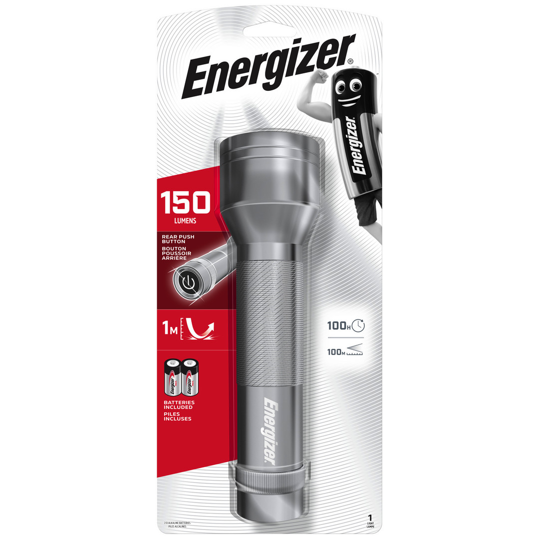 Eine langlebige Taschenlampe mit guten Leistungseigenschaften kann sowohl einfach, als auch kostengünstig sein. Das perfekte Beispiel: die Energizer Metalltaschenlampe. Diese Taschenlampe besteht aus einer robusten Metallkonstruktion und ist im Alltag immer einsatzbereit. Auf Knopfdruck liefert diese LED-Taschenlampe ein klares, gleichmäßiges Licht mit 135 Lumen. Dank einer Betriebsdauer von 150 Stunden haben Sie bei Ihren Heimwerker- und beruflichen Projekten ausreichend Licht. Sie eignet sich zudem hervorragend für Campingausflüge, Urlaubsfahrten und Versteckspiele während des Aussitzens von Stromausfällen. Stürze aus einer Höhe von bis zu 1 Meter können ihr nichts anhaben. Sie verfügt über einen texturierten Griff für gute Griffeigenschaften. Diese Taschenlampe bietet eine hohe Lumenzahl wie bei einer Arbeitsleuchte und die Robustheit einer Notfalltaschenlampe in einer handlichen Metallkonstruktion. Diese robuste Hochleistungstaschenlampe ist leicht zu bedienen und schont den Geldbeutel. Das ist die Energizer-LED-Metalltaschenlampe. Inklusive 2 Energizer MAX D-Batterien