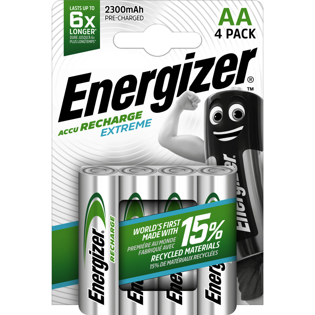 Holen Sie das Beste aus Ihren Geräten heraus – mit langanhaltender, wiederaufladbarer Power von Energizer. Egal ob Sie wiederaufladbare Batterien für Fernbedienungen, Spielzeug, Taschenlampen, Lichterketten, Kameras oder andere Elektrogeräte benötigen – mit diesen Akkus von Energizer treffen Sie die ideale Wahl! Die Energizer Accu Recharge Extreme AA-Batterien verfügen über eine Leistung von 2300 mAH und werden bereits vorgeladen geliefert. Sie speichern ihre Stromladung bis zu 12 Monate bei Lagerung. Außerdem können diese Akkus etwa 500 Mal wiederaufgeladen werden und bieten durch ihre auslaufsichere Konstruktion stets Schutz für Ihre Geräte (bei normalem Gebrauch). Das Energizer Accu Recharge Extreme Sortiment umfasst auch AAA-Batterien. So können Sie jederzeit ganz bequem auf die für Sie relevante Batteriegöße mit enormer Leistungsstärke für Ihr Gerät zurückgreifen. Bei Interesse an Ladegeräten stehen Ihnen auch unsere Charger aus dem Energizer Accu Recharge Sortiment zur Auswahl – ideal für wiederaufladbare Batterien. Wir sind uns bewusst, wie wichtig es ist, sich um unseren Planeten und seine Grünflächen zu kümmern. Aus diesem Grund werden diese Batterien in zu 100 % recycelbaren, plastikfreien Verpackungen* verkauft, um eine verantwortungsvolle Forstwirtschaft zu fördern. * Mit Ausnahme der Siegel auf ausgewählten Verpackungen
