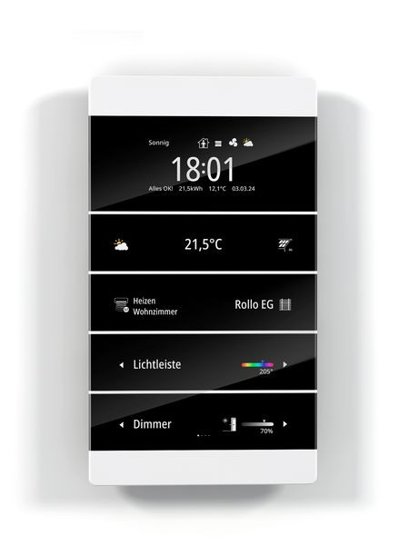 Mit etwa 310 verschiedenen Icons, freier Farbwahl für Texte und Icons, sowie Schriftsätzen für verschiedene Sprachen (Westeuropäische und Osteuropäische Codierung, kyrillisch, griechisch, hebräisch, arabisch) bietet der Raumcontroller eine hohe Anpassbarkeit. Die separate Menü-Taste ermöglicht ein einfaches Umschalten zwischen bis zu zehn frei konfigurierbaren Menüebenen. Zwei externe Eingänge können für Temperatur-Fernfühler oder als Binäreingang genutzt werden. Der integrierte Busankoppler versorgt das Gerät über den KNX Bus ohne zusätzliche Stromversorgung.