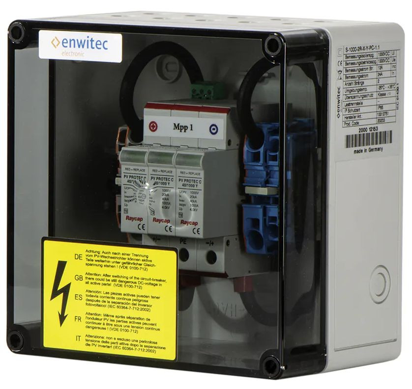 Generatoranschlusskasten für 1-2 Stränge, Überspannungsschutz: Typ 2, Bemessungsstrom: 12 A, Auslegungsstrom: 15 A, max. Strangspannung: 1.000 VDC, max. Kabelquerschnitt (ein): 10 mm², max. Kabelquerschnitt (aus): 25 mm², Abmessungen (B×H×T): 180 × 180 × 111 mm, transparenter Deckel