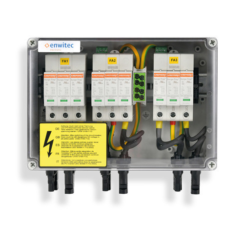 DC-Generatoranschlusskästen sind unverzichtbare Komponenten für private und gewerbliche Photovoltaikanlagen. Der GAK-enwitec-S-1000-3x1R-X-Y-PC-1.0_MC4 (Artikelnummer 10014799) ist ein leistungsfähiges Beispiel für diese Technologie. Ausgelegt für eine maximale Systemspannung von 1000 VDC, verfügt er über drei MPP-Tracker mit jeweils einem String im Ein- und Ausgang pro MPP. Obwohl keine Strangsicherung integriert ist, bietet er einen robusten Überspannungsschutz der Klasse II/C. Die Anschlüsse erfolgen über MC4-Stecker, was eine einfache und sichere Installation ermöglicht. Mit einem Bemessungsstrom Isc von 96 ADC und 32 ADC pro Strang ist er für anspruchsvolle Anwendungen in der Photovoltaik optimal dimensioniert. Der kompakte Anschlusskasten misst 250 x 175 x 100 mm (BxHxT) und wiegt 2,7 kg, was eine flexible Montage erlaubt. Es ist zu beachten, dass dieser GAK keinen integrierten Trennschalter besitzt. Für detaillierte technische Informationen und optimale Integration in die jeweilige Photovoltaikanlage sollte das Datenblatt sorgfältig konsultiert werden.