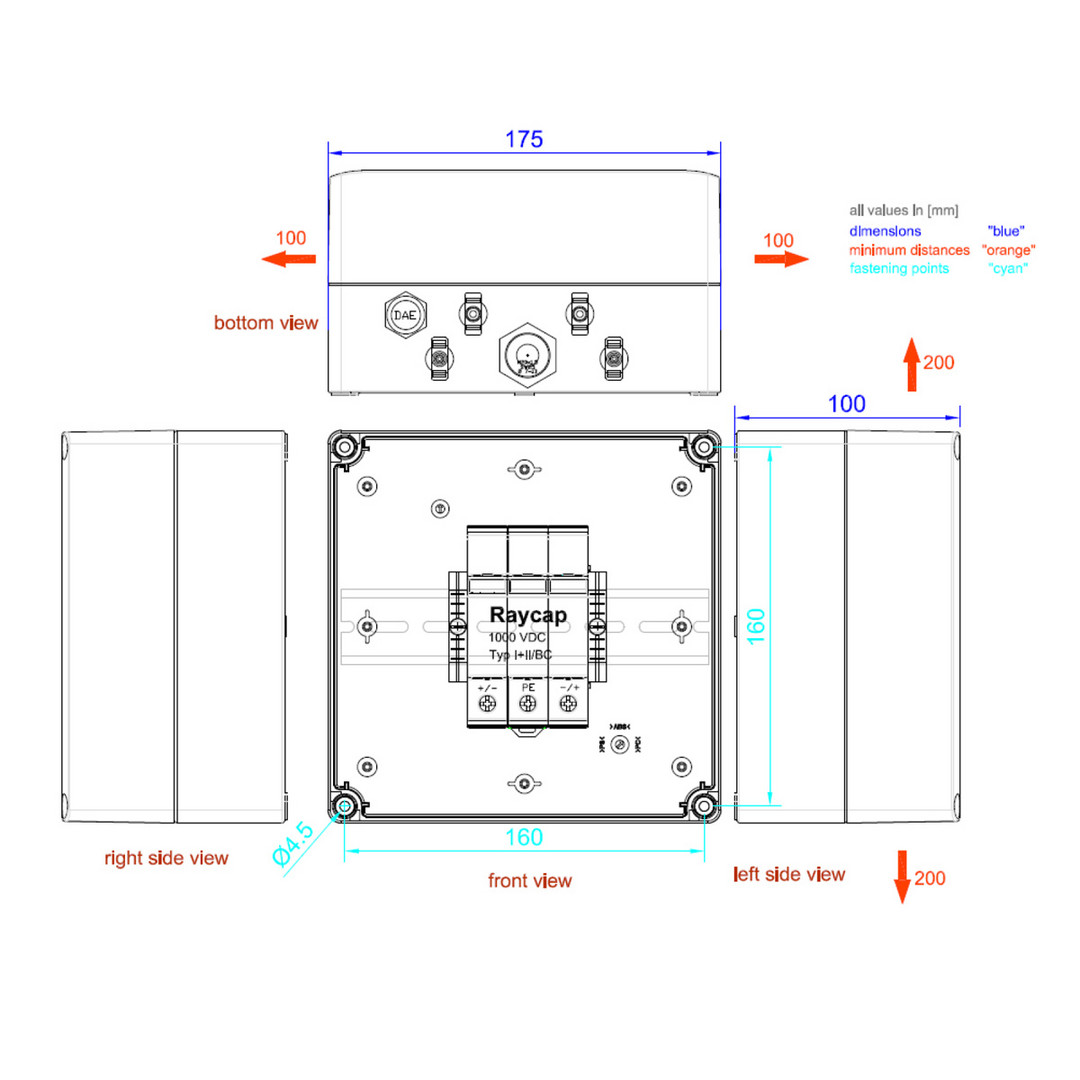 "Bem.-Isolierspannung Ui [VDC]: 1000 Bem.-Betriebsspannung Ue [VDC]: 1000 Anzahl unabhängige MPP Eingänge [n]: 1 Anzahl Stränge pro MPP IN [n]: 1 Anzahl Stränge pro MPP OUT [n]: 1 Bemessungsstrom InA (=Summe Isc STC) [ADC]: 32 Auslegungsstrom* Isc max [ADC]: 40 (=Summe Isc STC x 1,25) PRO STRANG: Bemessungsstrom Inc (=Isc STC) [ADC]: 32 Auslegungsstrom* Isc max [ADC]: 40 (= Isc STC x 1,25) Umgebungstemperatur: -25°C - +35°C (kurzzeitig 40°C) Überspannungsschutz: Klasse I-II/""BC"" Sicherungshalter: - Sicherung: - Lasttrennstelle: - Eingang: MC4 Ausgang: MC4 Schutzklasse: II IP Schutzart: IP65 Konformität: IEC 61439-1/2 Art der Montage: Wandmontage Abmessungen:(BxHxT)mm 175 x 175 x 100 Gehäuse: Polycarbonat (PC) Gehäuse mit transparentem Schraubdeckel Montageart: Im Innenbereich oder im geschützten Außenbereich (KEINE direkte Bewitterung!) Einführungen 1x MC4-Paar am Eingang und 1x MC4-Paar am Ausgang Erde: 1x M20 (d= 6,0-13,0) * der Auslegungsstrom ISC MAX lt. VDE 0100-712:2016-10 beinhaltet den Faktor 1,25 für ISC STC des PV-Moduls, bzw. des PV-Stranges."