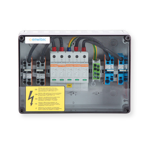 DC-Generatoranschlusskästen sind unverzichtbare Komponenten für private und gewerbliche Photovoltaikanlagen. Der GAK-enwitec-S-1000-2x2R-X-BC-PC-1.0 (Artikelnummer 10015829) ist ein leistungsfähiges Beispiel für diese Technologie. Ausgelegt für eine maximale Systemspannung von 1000 VDC, verfügt er über zwei MPP-Tracker mit jeweils vier Strings im Eingang und zwei im Ausgang pro MPP. Obwohl keine Strangsicherung integriert ist, bietet er einen robusten Überspannungsschutz der Klasse I+II/BC. Die Anschlüsse erfolgen über Verschraubungen, was eine sichere und zuverlässige Verbindung gewährleistet. Mit einem Bemessungsstrom Isc von 64 ADC und 16 ADC pro Strang ist er für anspruchsvolle Anwendungen in der Photovoltaik optimal dimensioniert. Der kompakte Anschlusskasten misst 254 x 180 x 111 mm (BxHxT) und wiegt 2,3 kg, was eine flexible Montage erlaubt. Es ist zu beachten, dass dieser GAK keinen integrierten Trennschalter besitzt. Für detaillierte technische Informationen und optimale Integration in die jeweilige Photovoltaikanlage sollte das Datenblatt sorgfältig konsultiert werden.