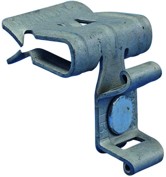 Federstahlbefestigung mit Kabelbindersockel zur Sicherung des Kabels parallel zum Trägerflansch. Montiert auf 8–12 mm Flansch, Kabelbinder nicht im Lieferumfang enthalten.
