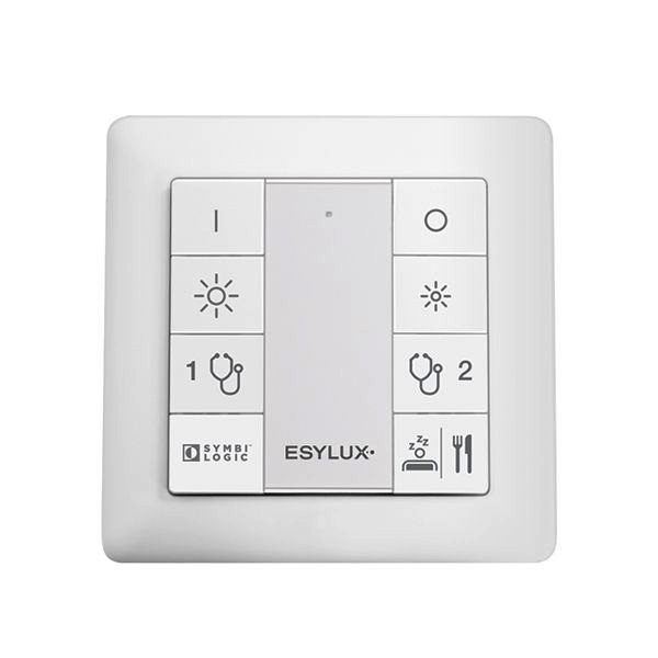 8-fach Taster. Zur Steuerung von Lichtszenen und zur manuellen Übersteuerung< von Leuchten in Patientenzimmer. Standardfunktionen: Ein, aus, dimmen. Vier Lichtszenen können abgerufen werden.
