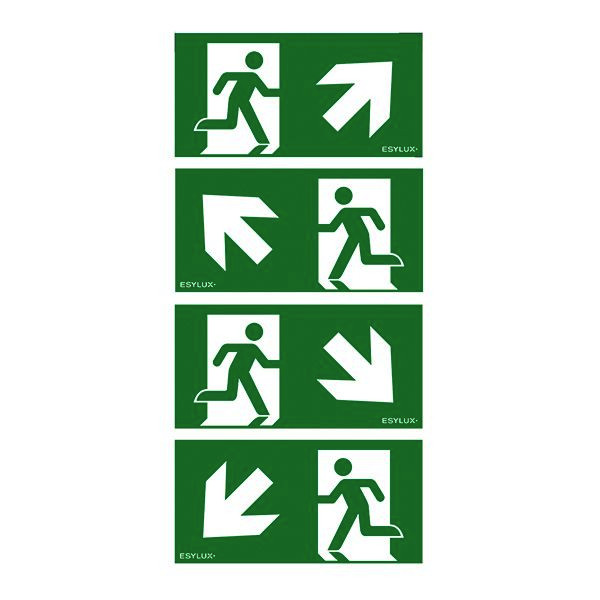 Piktogramm-Satz für Einzelbatterie-Notleuchten der Serie SLB. Satz bestehend aus: 4 selbstklebenden Piktogramm-Folien mit 21 m Erkennungsweite (Pfeil oben rechts, oben links, unten rechts und unten links).