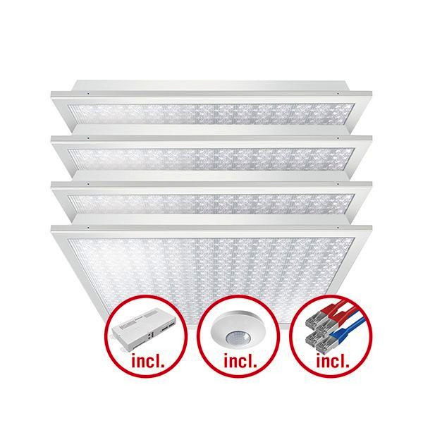 Vorkonfiguriertes, einbaufertiges Lichtsystem mit ESYLUX Light Control ELC. Optimiert für Büros bis ca. 20 m². Lieferumfang: 4x ELC-Leuchten mit prismatischem Diffusor, Kabel mit RJ45 Steckern, Ferrite, ELC-Steuerung, ELC-Präsenzmelder mit Anschlußkabel RJ10. Einsetzbar als Deckeneinlegeleuchte für Systemdecken mit verdeckten oder sichtbaren Tragschienen für Systemmaß 600 mm x 600 mm (Bitte Besonderheiten und evtl. Einschränkungen des Deckensystemherstellers beachten!). Bildschirmarbeitsplatztauglich nach EN 12464-1. Einfaches Parametrieren, Fernsteuern und Dokumentieren per ESY-App. Farbtemperatur 2700-6500 K (Tunable White).