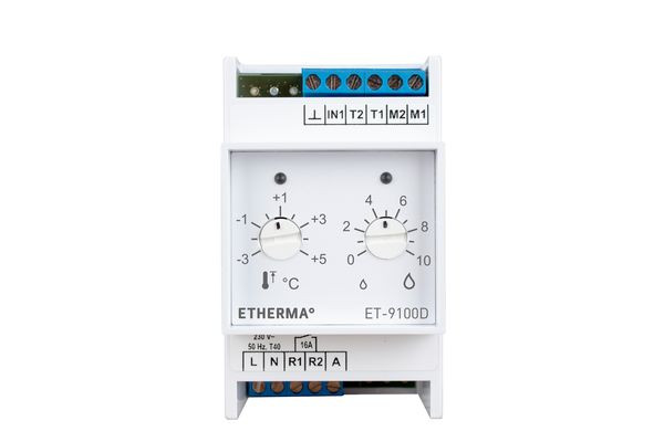 Der Eis- und Schneemelder ET-9100D ist optimal für den Einsatz bei Dachrinnenheizungen geeignet und als Einstiegsmodell insbesondere für die Steuerung von kleinen Anlagen mit einem Temperatur- und Feuchtesensor und einem Heizkreis prädestiniert. Eine unkomplizierte Inbetriebnahme wird durch nur zwei Drehsteller für die Aktivierungstemperatur und die Feuchteschwelle erreicht. Weitere Funktionsparameter wie untere Abschalttemperatur, Mindest- und Nachheizzeit sind bei Bedarf über einen Parametriermodus einstellbar. Für die Betriebsanzeige sorgen zwei Dreifarben-LEDs. Für einen Fühler (ET-3354) geeignet. Messbereich -30 °C bis °C, IP 20, Last max. 16 A, 230 V.