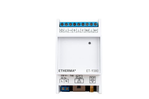 Das kompakte WLAN/LAN-Modul ET-9380 ist die Neuerung im Eis- und Schneemeldesegment. Mit Hilfe des Gateway kann erstmalig ein Eis- und Schnellmeldesystem eine Wettervorhersage verarbeiten und dem Kunden seinen Status mitteilen, konfiguriert (wichtigsten Einstellungen) und fernbedient werden. Das Gateway dient der Verbindung des Eis- und Schneemelders vom ET-9300 und ggf. dessen Erweiterungsgeräte zum ETHERMA-Portal im Internet. Das Gateway kann per Netzwerkkabel an einen handelsüblichen DSL/UMTS Router angeschlossen werden und verfügt zusätzlich über eine WLAN