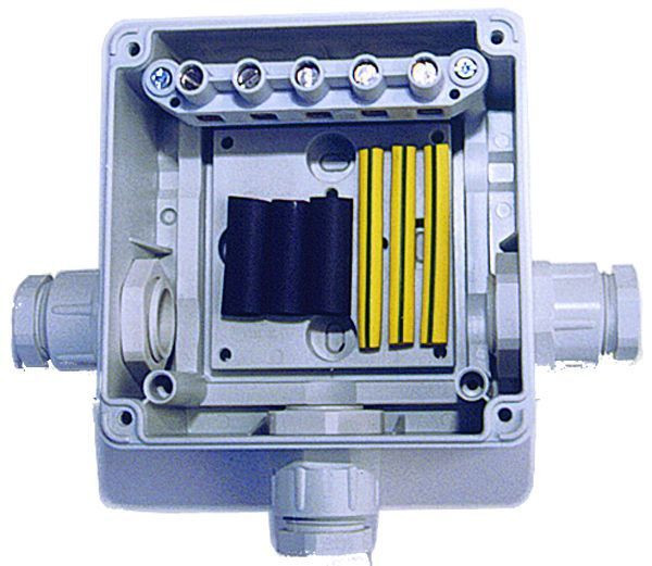Das Set enhält alle notwendigen Komponenten für den sicheren Anschluss oder der Verteilung von Heizbändern und Anschlussleitungen. Es besteht aus einer Anschlussdose, den Verschraubungen, dem Schrumpfmaterial und einem Klemmbock.
