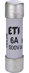 Sicherungseinsatz, CH10x38 gG 6A/500V, Anwendung zum Kabelschutz, Abschaltleistung AC (kA) 100, Charakteristiken gG, Abmessungen 10X38, Pd (W) 1,6, Bemessungsspannung AC 500, Bemessungsstrom (A) 6, Größe CH10, Standard IEC 60269-1, IEC 60269-2, Typ CH