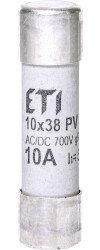 Sicherungseinsatz, CH10x38 gR 10A/700V AC/DC, Abmessungen 10x38, Bemessungsspannung DC 700, Bemessungsstrom (A) 10, Typ CH, Größe CH10, Produktgruppe Spezialsicherungseinsätze, Produktuntergruppe PV, Charakteristiken gR, Bemessungsspannung AC 700, Abschaltleistung AC (kA) 50, Abschaltleistung DC (kA) 8, Pd (W) 2,44, Anwendung zum Schutz von Halbleiterbauelementen, Betriebs-Jule-Integrall (A2s) 73, Verlustleistung (0,7xIn) (W) 0,98, Schmelz-Joule-Integral (A2s) 20, Standard IEC 60269-4