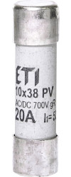Sicherungseinsatz, CH10x38 gR 20A/700V AC/DC, Abmessungen 10x38, Bemessungsspannung DC 700, Bemessungsstrom (A) 20, Typ CH, Größe CH10, Produktgruppe Spezialsicherungseinsätze, Produktuntergruppe PV, Charakteristiken gR, Bemessungsspannung AC 700, Abschaltleistung AC (kA) 50, Abschaltleistung DC (kA) 8, Pd (W) 3, Anwendung zum Schutz von Halbleiterbauelementen, Betriebs-Jule-Integrall (A2s) 301, Verlustleistung (0,7xIn) (W) 1,27, Schmelz-Joule-Integral (A2s) 164, Standard IEC 60269-4