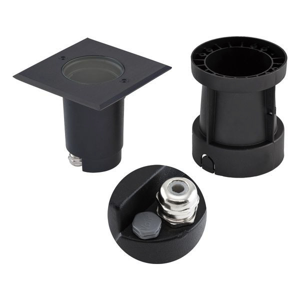 Der Leuchtenkörper ist aus Aluminium, die Abdeckplatte hingegen aus V2A-Edelstahl gefertigt. Die Kabeleinführung erfolgt über die am Boden befindliche Kabelverschraubung, welche für Kabel bis 9mm Durchmesser geeignet ist. Zur Vermeidung von Kondenswasser befindet sich auf der Unterseite der Leuchte ein selbstentlüftendes Entlüftungsventil. Es besteht die Möglichkeit, die Leuchte ohne den im Lieferumfang enthaltenen Kunststoff-Einbautopf zu montieren, in diesem Fall beträgt der Lochausschnitt 96mm während die Einbautiefe unverändert bleibt. Durch die GU10 Hochvoltfassung können unterschiedliche Leuchtmittel bis max. 35W in der Leuchte betrieben werden. Der Schwenkwinkel beträgt 10°. Zusätzlich ist ein mattes Schutzglas im Lieferumfang enthalten.