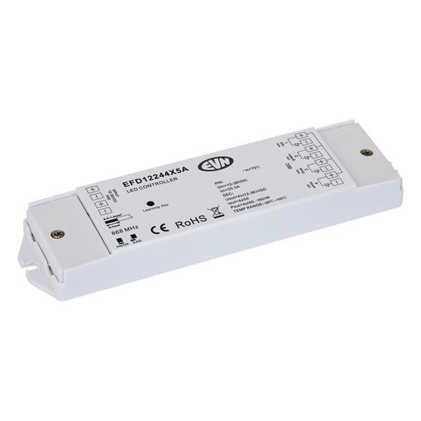 Der LED-Multicolor-Empfänger kann für Unicolor-, Tunable-White-, RGB-, und RGBW-Leuchten verwendet werden. Geeignet für Leuchten mit einer Betriebsspannung von 12, 24 und 36V/DC. Die tatsächlich zu verwendende Eingangsspannung ist abhängig von der benötigten Spannung der angeschlossenen Leuchten. 1x Eingang, so wie 1x Ausgang für 12-36V/DC und 4x Ausgang (RGBW). Die Schraubklemmen sind für Kabel von 0,5mm² - 1,5mm² geeignet. Technische Daten: ta: -20°C - 50°C, tc: 75°C, max. Ausgangsleistung je Kanal: 5A (60W bei 12V/DC, 120W bei 24V/DC und 180W bei 36V/DC). Die Ansteuerung erfolgt über Funk-Sender mit 868MHz. Um auch größere Anlagen problemlos umsetzen zu können, können mehrere Controller als Master-Slave-Anwendung synchron gesteuert werden.