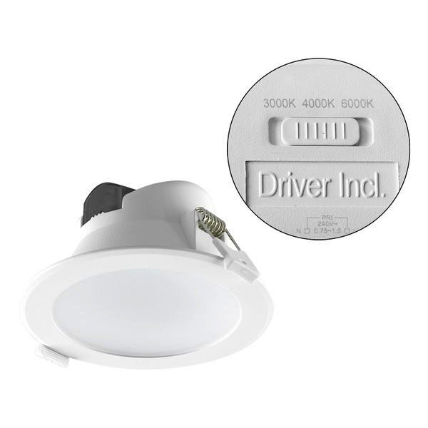LED Deckeneinbauleuchte für vielfältige Anwendungen im Innenbereich. Sowohl Effektbeleuchtungen, Raumbeleuchtung, Akzentuierte Beleuchtung und vieles mehr, lassen sich mit dieser Leuchte umsetzten. Durch das integrierte Netzgerät, kann die Leuchte direkt an die 230V-Zuleitung angeschlossen werden, dadurch entfallen zusätzliche Kosten für Betriebsgeräte. Im eingebauten Zustand erreicht die Leuchte frontseitig die Schutzart IP44. Mit dem an der Rückseite angebrachten Schalter kann eine von drei möglichen Farbtemperaturen eingestellt werden. Die Leuchte kann auch über eine Zentralbatterie betrieben werden, mit einer Eingangsspannung von 176-250V/DC. Die möglichen Farbtemperaturen und daraus resultierenden Lumen sind: 3000K (800lm), 4000K (891lm) und 6000K (820lm).