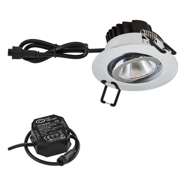 LED Einbaustrahler, Einsatz auch im Badbereich, schwenkbar: bis 20°, ausstrahlwinkel: 38°, dimmbar, gehäuse: Aluminium, Externes Betriebsgerät enthalten, IP65, Maße Ø: 83 / ET: 45 / DA: 68, 3000K, 8,4W, Chrom.