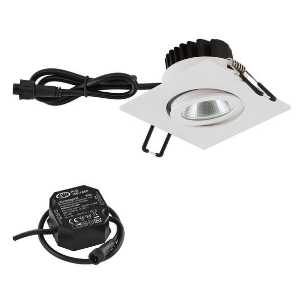 LED Einbaustrahler, Einsatz auch im Badbereich, schwenkbar bis 20°, Ausstrahlwinkel 38°, dimmbar, Gehäuse Aluminium, Externes Betriebsgerät enthalten, IP65, Maße L: 83 / B: 83 / ET: 45 / DA: Ø 68, 3000K, 8,4W, weiss