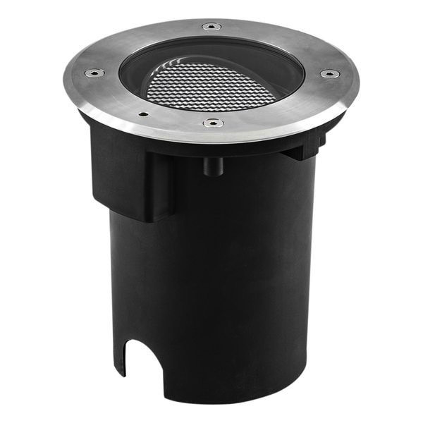 Der Leuchtenkörper der Bodeneinbauleuchte ist aus massivem Aluminium gefertigt, der obere Abdeckring hingegen aus V2A-Edelstahl und kann für vielfältige Anwendungen im Außenbereich verwendet werden. Die Montage erfolgt mittels der im Lieferumfang befindlichen Kunststoff-Einbauhülse. Über eine Justierschraube kann die Leuchte im eingebauten Zustand jederzeit geschwenkt werden, der Schwenkwinkel beträgt hierbei 20°. Außerdem entstehen auch keine zusätzlichen Kosten für ein Vorschaltgerät, da der Anschluss direkt an die 230V-Zuleitung erfolgt. Zur Vermeidung von Kondenswasser befindet sich auf der Unterseite der Leuchte ein selbstentlüftendes Entlüftungsventil. Außerdem ist die Leuchte mit einem Honeycomb Blendschutz ausgestattet. Die maximale Überfahrgeschwindigkeit beträgt 20km/h. Die Leuchte hat eine 0,50m lange Anschlussleitung (ÖLFLEX CLASSIC 110 BLACK 3 x 0,75mm²) mit freien Aderenden. Der Ausstrahlwinkel beträgt 38°, Bemessungslebensdauer L80/B10 bei 25 °C: 39300h.