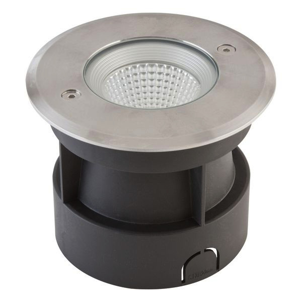 Der Leuchtenkörper der Bodeneinbauleuchte ist aus massivem Aluminium gefertigt, der obere Abdeckring hingegen aus V2A-Edelstahl und kann für vielfältige Anwendungen im Außenbereich verwendet werden. Die Montage erfolgt mittels der im Lieferumfang befindlichen Kunststoff-Einbauhülse. Da der COB-LED-Chip fest verbaut ist, fallen keine zusätzlichen Kosten für Leuchtmittel an. Ebenso entstehen auch keine zusätzlichen Kosten für ein Vorschaltgerät, da der Anschluss direkt an die 230V-Zuleitung erfolgt. Die maximale Überfahrgeschwindigkeit beträgt 20km/h. Die Leuchte hat eine 0,50m lange Anschlussleitung (ÖLFLEX CLASSIC 110 BLACK 3 x 0,75mm²) mit freien Aderenden. Der Ausstrahlwinkel beträgt 60°.