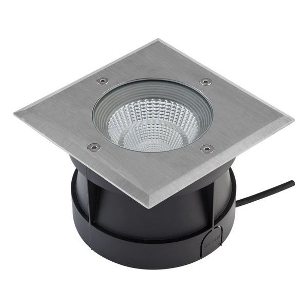 Der Leuchtenkörper der Bodeneinbauleuchte ist aus massivem Aluminium gefertigt, die obere Abdeckung hingegen aus V2A-Edelstahl und kann für vielfältige Anwendungen im Außenbereich verwendet werden. Die Montage erfolgt mittels der im Lieferumfang befindlichen Kunststoff-Einbauhülse. Da der COB-LED-Chip fest verbaut ist, fallen keine zusätzlichen Kosten für Leuchtmittel an. Ebenso entstehen auch keine zusätzlichen Kosten für ein Vorschaltgerät, da der Anschluss direkt an die 230V-Zuleitung erfolgt. Zusätzlich befindet sich auf der Unterseite ein selbstentlüftendes Ventil. Die Leuchte hat eine 0,50m lange Anschlussleitung (ÖLFLEX CLASSIC 110 BLACK 3 x 0,75mm²) mit freien Aderenden. Die maximale Überfahrgeschwindigkeit beträgt 20km/h. Der Abstrahlwinkel beträgt 60°. Bei Verwendung des optional erhältlichen matten Glas (PC6710889) verringert sich die Lichtausbeute auf 950lm.