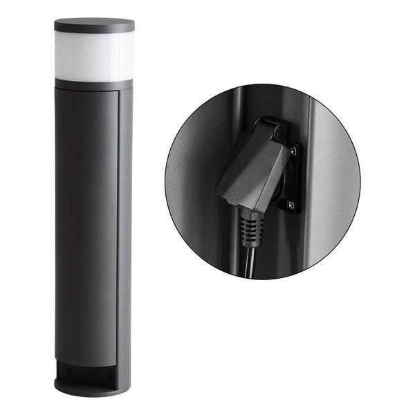 LED Wegeleuchte mit zwei integrierten Steckdosen hinter der Tür an der Frontseite der Leuchte. Bei Verwendung von Winkelsteckern kann die Tür auch bei angeschlossenen Verbrauchern geschlossen werden. Die Steckdosen können bis max. 16A und 3680W belastet werden. Da die Steckdosen und die LED über getrennte Phasen angeschlossen werden, können diese separat über externe Schalter geschaltet werden.
