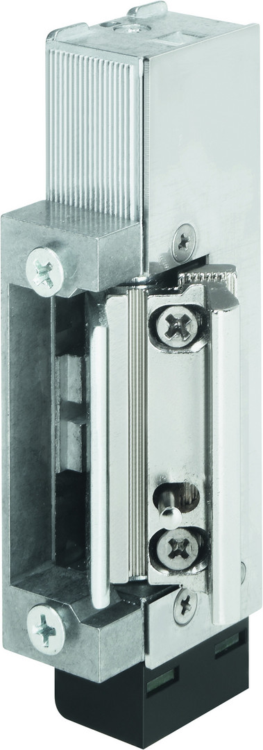 Speziell auf Schlossriegel konstruierte Türöffnerfalle: Bei offener Tür ist die Türöffnerfalle im Gegensatz zu Standard-Türöffnern aufgeklappt und somit in Position zur Riegelaufnahme.|Bei offener Tür ist die Türöffnerfalle im Gegensatz zu Standard-Türöffnern aufgeklappt und somit in Position zur Riegelaufnahme|Beim Schließen der Tür wird die Türöffnerfalle vom Riegel in die Geschlossen-Position bewegt|Nicht bestromt ist bei Arbeitsstromtypen der Türöffner sofort verriegelt.|Bei den Arbeitsstromtypen wird die Funktion zusätzlich durch einen Sicherungsstift gesteuert. Nur bei Betätigung des Sicherungsstiftes durch den Schlossriegel kann die Verriegelung erfolgen. Ein unbeabsichtigtes Verriegeln bei offener Tür wird dadurch zuverlässig verhindert.