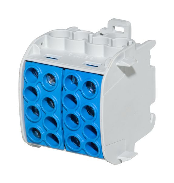 HLAK1p35Dbl; Hauptleitungsabzweigklemme, 1-polig, 35 mm²/Doppelblock ("N"); Zugang 4 x 35 mm², Abgang 4 x 25 mm²; Anschlüsse zertifiziert nach DIN VDE 0603-2; Mit Schnappbefestigung für waagerechte Montage