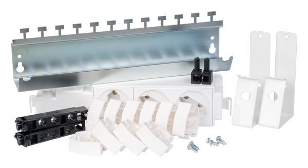 Medienverteiler Ausbaupaket 2. Set-Inhalt: 1x 3-fach Steckdose, 1x Geräteklammer-Set, 10x Kabelklammer, 1x Patchfeld