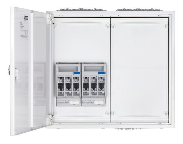 Sammelschienensystem 5-polig, 250 A; 2 x NH00-Trenner 160A; Zu- und Abgänge bis 70mm²; Kabelabfangschiene; Schutzart IP31/43; Hauben plombierbar; Gehäuse 2-feldrig, 3-reihig, Gehäuse: 500mm x 550mm x 165mm