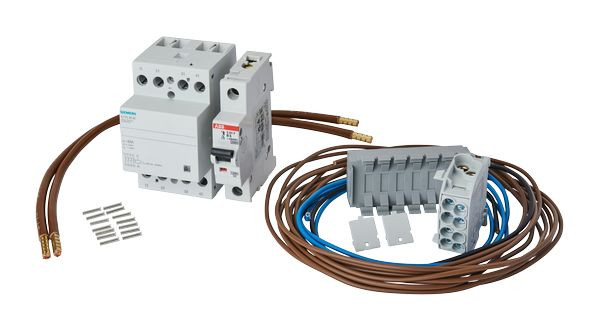 Verdrahtungspaket Wärmepumpe 63A, WP63-Set. Besteht aus: Schütz 63A 4-polig, Plombierkappe, LS-Schalter 6A 1-polig 10kA, Steuerleitungsklemme, HLAK 25mm² 1-polig grau, Verdrahtung.