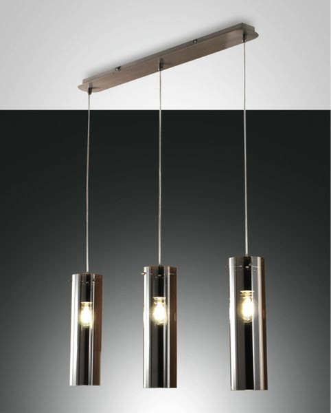 Dimmbar: abhängig vom verwendeten Leuchtmittel, Durchmesser: 10 cm, Höhe: 35 cm, Deckenabhängung: max. 200 cm, Oberfläche: Nickel matt, Glas: Grau, Bestückung 3 x E27 max. 60 Watt, Leuchtmittel enthalten: nein