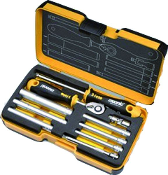 R-GO XL Box M-Tec 1/4 Zoll Werkzeug-Sets mit Ergonic- Ratsche: perfekt und zuverlässig, ohne Kompromisse, Extrem starke Umschaltmechanik mit Super-Feinverzahnung (größer 65Nm, 72 Zähne, 5° Rückholwinkel), Steckschlüssel- Sicherheitsverriegelung (mit Druckknopfauslösung), Ergonic-Griff unlösbar mit dem Schmiedeteil verbunden 1x ERGONIC Ratsche 1/4" 1x ERGONIC Schraubendreher mit 1/4" Adapter für Steckschlüsseleinsätze 6x M-Tec Steckschlüssel mit Neodym-Magnet 5,5mm/ 6mm/ 7mm/ 8mm/ 10mm/ 13mm 1 x Verlängerung (100mm) 1/4" - 1/4" 1 x Kardangelenk 1/4"