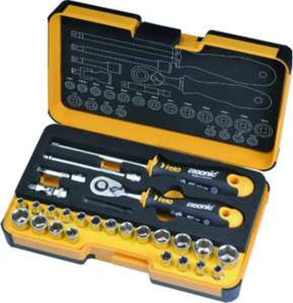 R-GO XL Box, 1/4 Zoll Werkzeug-Sets mit Ergonic-Ratsche, Ratsche mit Steckschlüssel-Sicherheitsverriegelung, extrem starke Umschaltmechanik mit Super-Feinverzahnung (>100 Nm, 72 Zähne, 5° Rückholwinkel), patentierter Ergonic-Griff mit Kissen-Effekt, Inhalt: Steckeinsätze von 4 - 14 mm und 3/16 - 1/2 Zoll, kurze und lange Verlängerung, Kreuz-Gelenk, Adapter, Ergonic-Griff, Ergonic-Ratsche, in stabiler StrongBox, 15 Jahre Garantie