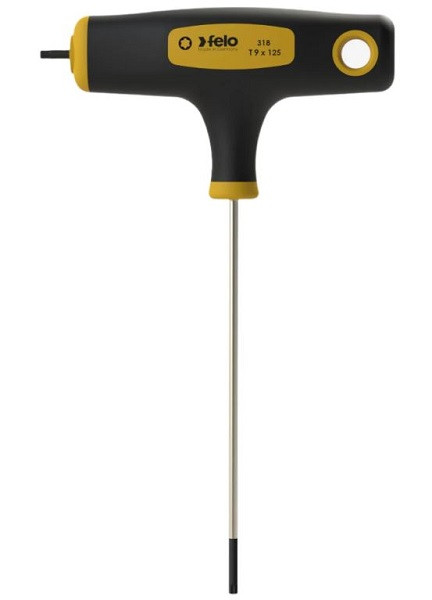 Felo 31809360 Doppel-Torx-T-Griff, T9 x 125 mm Langes Ende für präzises Eindrehen schwer zugänglicher Schrauben. Das Griffende verfügt über einen kurzen Schraubendreher für hohe Drehmomente. Aufhängeöse für einfache Aufbewahrung. Ergonomischer 2-Komponenten-Griff mit Softgrip-Beschichtung reduziert Druckstellen. Harter Kunststoffkern für Langlebigkeit, auch bei höchsten Drehmomenten. Matte Chrombeschichtung mit schwarzen Spitzen. Griffbreite: 100 mm. Klingenlänge: 125 mm. Oberfläche: Satinierte Chromoberfläche Griffmaterial: Mehrkomponentenmaterial Einzelperson / Set: Einzelperson Werkzeugspitzen-Stil: Torx Spitzengröße: Torx T9