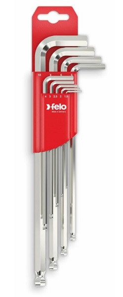 Felo 36500911 Kugelkopf-Sechskantschlüssel-Set (metrisch), 1,5 - 10 mm, 9-teilig Vernickelt für Korrosionsbeständigkeit. Kugelgelenk am langen Ende ermöglicht schräges Eindrehen. Inklusive Kunststoffclip-Organizer. Set beinhaltet: 1,5, 2,0, 2,5, 3,0, 4,0, 5,0, 6,0, 8,0, 10,0 mm Einzeln / Set: Werkzeugsets Oberfläche: Vernickelt Merkmale: Kugelende Spitzenform: Sechskant Spitzengröße: Sechskant metrisch 1,5 mm Sechskant metrisch 2,0 mm Sechskant metrisch 2,5 mm Sechskant metrisch 3,0 mm Sechskant metrisch 4,0 mm Sechskant metrisch 5,0 mm Sechskant metrisch 6,0 mm Sechskant metrisch 8,0 mm Sechskant metrisch 10 mm