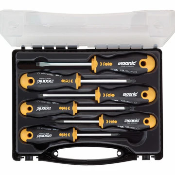 Felo 40010636 Ergonomisches Schraubendreher-Set, 6-teilig im Koffer Ergonomisches Schraubendreher-Set. ERGONIC ist der weltweit erste Griff, der sich der Hand des Benutzers anpasst. Sein ergonomischer, glatter und nahtloser Griff erhöht den Arbeitskomfort. Der Griff ist so geformt, dass das Werkzeug nicht von der Arbeitsfläche rollt. Die Schlitzart ist auf der Oberseite des Griffs angegeben. Die Verschleißfestigkeit ist um ein Vielfaches höher als die technischen Anforderungen von DIN und ISO. Das Set wird in einem praktischen Kunststoffkoffer zur Aufbewahrung der Schraubendreher geliefert. Setzusammensetzung: Serie 400 Keilwelle 4,0x100 / 6,5x100; Serie 401 PZ1x80 / ??PZ2x100; Serie 402 PH1x80 / ??PH2x100; Kunststoffkoffer Länge: 316 mm Breite: 245 mm Höhe: 40 mm Gewicht: 682 g Land: Deutschland