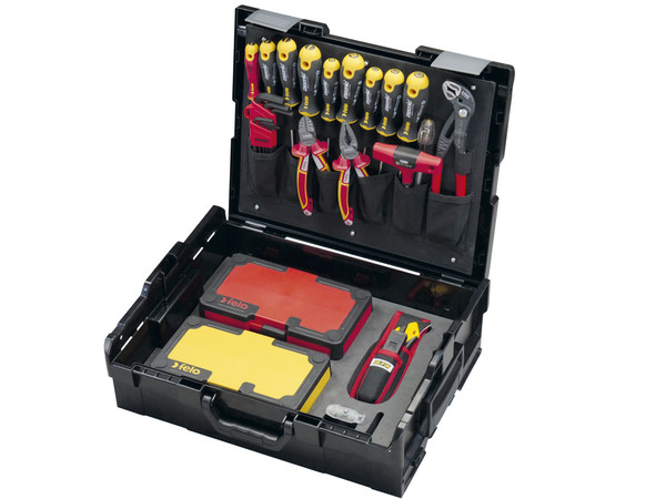 400 3x1: 4,0 x 100 / 5,5 x 125 / 6,5 x 150; 401 2x1: PZ 1 x 80 / PZ 2 x 100; 408 3x1: T 15 x 100 / T 20 x 100 / T 25 x 100; 413 1x1: 3,5 x 100; 361 1x1: 3,0 x 70; 397 1x1: T-Griff Adapter 1/4" x 125; 057 1x1: XL-Strongbox R-GO 36-tlg; 063 1x1: XL-Strongbox E-Smart VDE 14-tlg.; 365 1x1: Winkelschlüsselsatz mit Kugelkopf 9-tlg.; 580 1x1: VDE Kombizange 160 mm; 581 1x1: VDE Seitenschneider 160 mm; 895 1x1: Wasserpumpenzange MX 250 mm; 580 1x1: Spannungsprüfer "E-Detector"; C00 1x1: Olfa Cuttermesser L5 in Tasche; L-Boxx