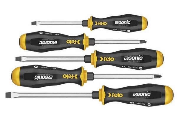 Felo 45095248 Ergischer Schlitz- und Kreuzschlitzschraubendreher-Satz mit Schlagkappe, 5-teilig Ergonic - der erste Griff, der sich der Hand des Benutzers anpasst. Der durchgehende, stoßfeste Griffkern ist mit einem elastischen, kratzfesten Elastomer beschichtet, das Zellen aus hochflexiblem Kunststoff enthält. Glatter, nahtloser Griff für maximalen Komfort. Mit Schlagkappe und Sechskantzwinge. Hand- und Griffverriegelung für weniger Belastung. Wegrollsicheres Griffdesign. Klingen aus Chrom-Molybdän-Vanadium-Stahl. Überragendes Drehmoment, das die DIN- und ISO-Anforderungen um bis zu 100 % übertrifft. Schwarze Spitze für präzisen Sitz. Einzeln / Set: Werkzeugsets Spitzenform: Phillips Schlitz Spitzengröße: Schlitz 4,5 mm Schlitz 5,5 mm Schlitz 7,5 mm Kreuzschlitz Nr. 1 Kreuzschlitz Nr. 2 Oberfläche: Schwarz Griffmaterial: Mehrkomponentenmaterial