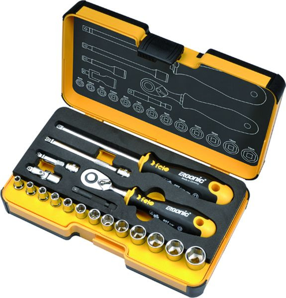 R-GO XL Box: 1/4 Zoll Werkzeug-Set mit Ergonic-Ratsche, mit Kissen-Effekt, Ratsche mit Steckschlüssel- Sicherheitsverriegelung, extrem starke Umschaltmechanik mit Super-Feinverzahnung (>100 Nm, 72 Zähne, 5° Rückholwinkel), der Griff ist unlösbar mit dem Schmiedeteil verbunden, hochwertig und langlebig: 15 Jahre Garantie auf jedes Stück, Inhalt: 13 Stecknüsse (4 - 14), 2 Adapter, kurze- und lange Verlängerung, Gelenk, Ratsche