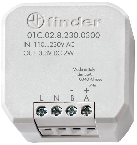 Netzteil zur Spannungsversorgung eines Bliss2 Raumthermostats, Montage in Unterputz- oder Schalterdose, Versorgungsspannung: 110…230 V AC, Ausgangsspannung: 3,3 V DC, Nennleistung: 2 W, Umgebungstemperatur: 0...40°C, max. Kabellänge zwischen Netzteil und BLISS2-Thermostat: 40 m (flexibles Kabel 2x1.5 mm2)