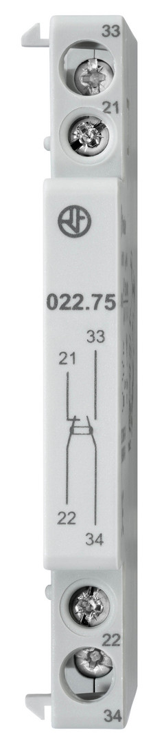 Hilfsschalter für Installationsschütze 22.74 mit 1 Öffner + 1 Schließer, In= 6 A, Kontaktmaterial AgNi, wird mechanisch vom Schütz angesteuert.