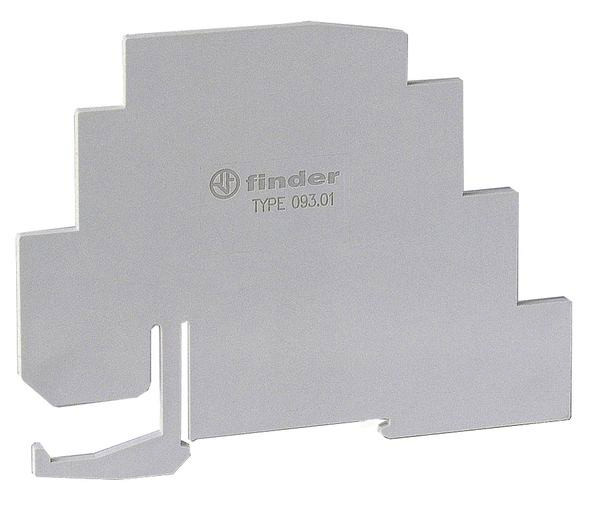 Isolationsplatte zur 'sicheren Trennung' nach VDE 0160 und VDE 0106 zwischen Kleinspannungen und anderen Spannungen, zur Trennung von Gruppen und als Isolation gegen metallische Tragschienen-Endhalter und andere Bauelemente, für Fassungen 93.01, 93.51, 93.02 und 93.52, Farbe: grau