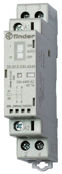 | Kurzbeschreibung | Schütz für Reiheneinbau, 2 Schließer 25 A, Spule 230 V AC/DC, On-Auto-Off - Schalter, LED-Anzeige |