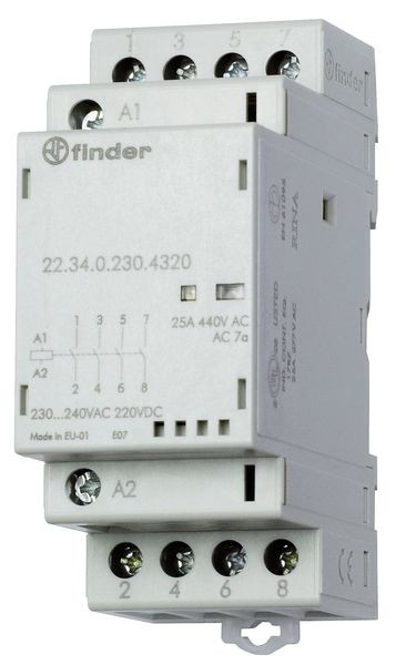 Installationsschütz für 35 mm-Schiene, 4 Schließer für 25 A / 250 V AC, Kontaktmaterial AgNi, max. Schaltleistungen bei 230 V AC: AC1 6250 VA, AC15 1800 VA, 3-Phasen-Motorlast, AC3 (400-440 V AC) 4 kW, Energiesparlampen 100 W, LED (230 V AC) 100 W, NV-Halogenlampen oder LED mit EVG 100 W, NV-Halogenlampen oder LED mit KVG 300 W. Spule: 230 V AC/DC, Breite 35 mm, mit LED und mechanischer Schaltstellungsanzeige, Relaisschutzart: IP 20
