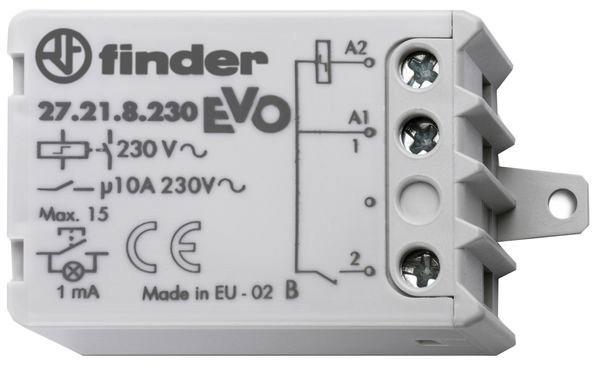 Stromstoßschalter EVO für Montage in Unterputzdose oder auf Chassis, 1 Schließer für 10 A / 250 V AC, max. Schaltleistungen bei 230 V AC: AC1-2.300 VA, AC15-500 VA, Glüh- und Halogenlampen- 1000 W, Leuchtstofflampen kompensiert 360 W, Leuchtstofflampen unkompensiert-400 W, Energiesparlampen 200 W, LED (230 V AC) 200 W, NV-Halogenlampen oder LED mit EVG 200 W, NV-Halogenlampen oder LED mit KVG 400 W, Schaltfolge: aus / an Kontaktmaterial AgNi, Spule mit Überhitzungsschutz. Relaisschutzart: IP 20