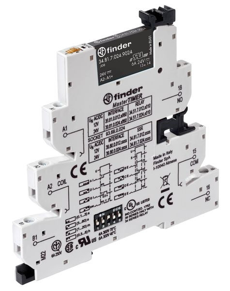 MasterTIMER schmales Zeitrelais für DIN-Schiene, mit Schraubanschlüssen, modular aufgebaut, SSR Kontakte 1 Schließer für 6 A 24 V DC, 8 Zeitablauffunktionen: Ansprechverzögerung, Einschaltwischer, Impulsgeber 0,5 Sek, Symmetrischer Blinkgeber-impulsbeginnend, Rückfallverzögerung über Startkontakt, Ansprech-Rückfallverzögerung über Startkontakt, Einschaltwischer über Startkontakt, Ausschaltwischer über öffnenden Startkontakt, 4 Zeitbereiche bis 6 Std, LED-Anzeige, Klemmen A1 oder A2 und 15+ sind brückbar, Ausgangssicherungsmodul Typ 093.63 für 5 x 20 mm Feinsicherungen anstelle des Blindstopfens einsetzbar, Spulenspannung 24 V AC/DC